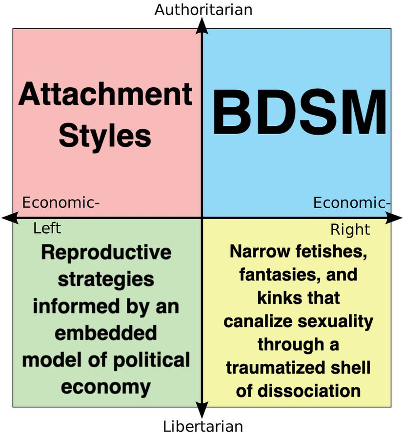 Seems like secure attachment, anxious preoccupied, and anxious avoidant are all CPTSD patterns that recapitulate parenting, and dismissive avoidant is a conflation of possibly traumatic despair & health. But definitely the emphasis is on the despair aspect even though the formal definition includes well-integrated behavior. By contrast, BDSM is more often a response to general social conditions. Attachment styles masquerade as normative, BDSM as transgressive.